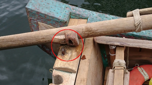 櫓は固定されておらず、船尾についた突起(櫓杭:ろぐい)を櫓側の凹部(入子:いれこ)に差し込んで漕ぐ(赤丸部分)。