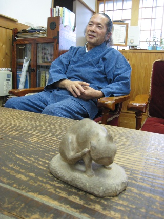 初期の頃に彫った木彫りの猫と及川孝一さん。